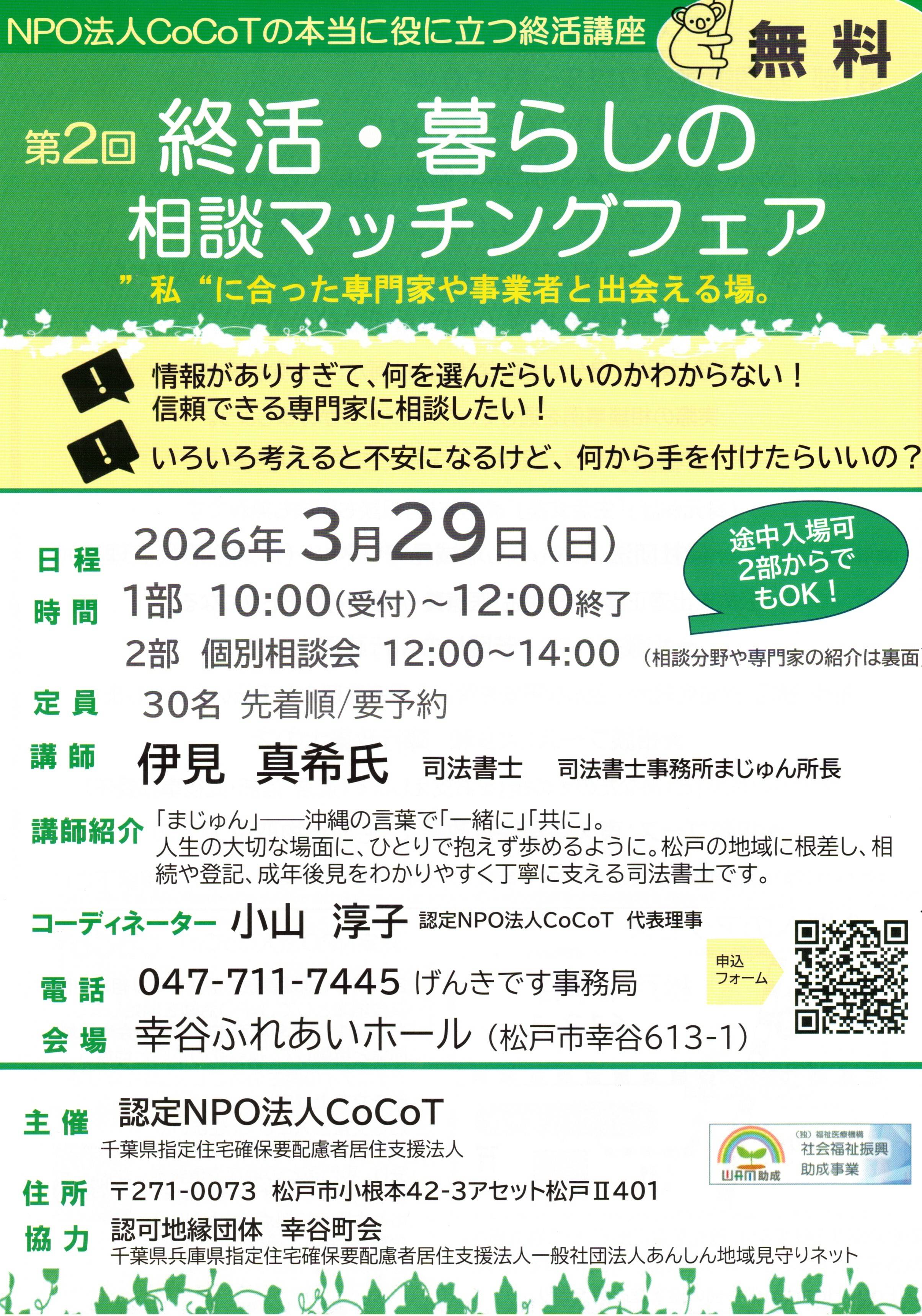 3月29日(日)晴天でぽかぽか陽気の一日でした。あちこちでさくら祭りが開催され、そちらに目も足も向いてしまった感じでしたが、新松戸駅より徒歩5分の幸谷ふれあいホールにて、『終活・くらしの相談マッチングフェア』が開催されました。