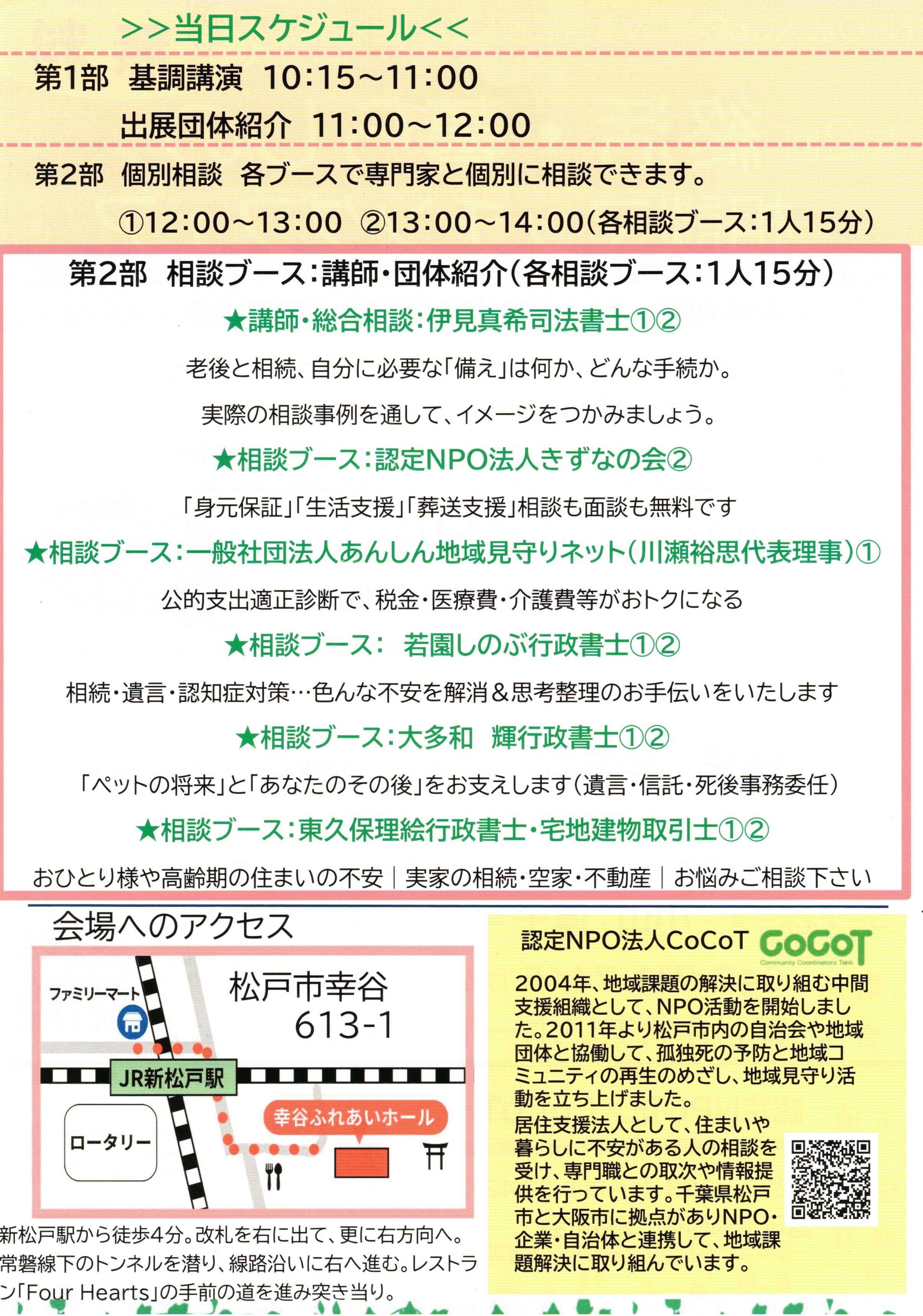 午前は司法書士によるセミナー、午後は各事業者がそれぞれブースを設けてお待ちする無料相談会となっています。ここでは、必ずしも具体的だったり、専門的な相談でなくとも構いません。